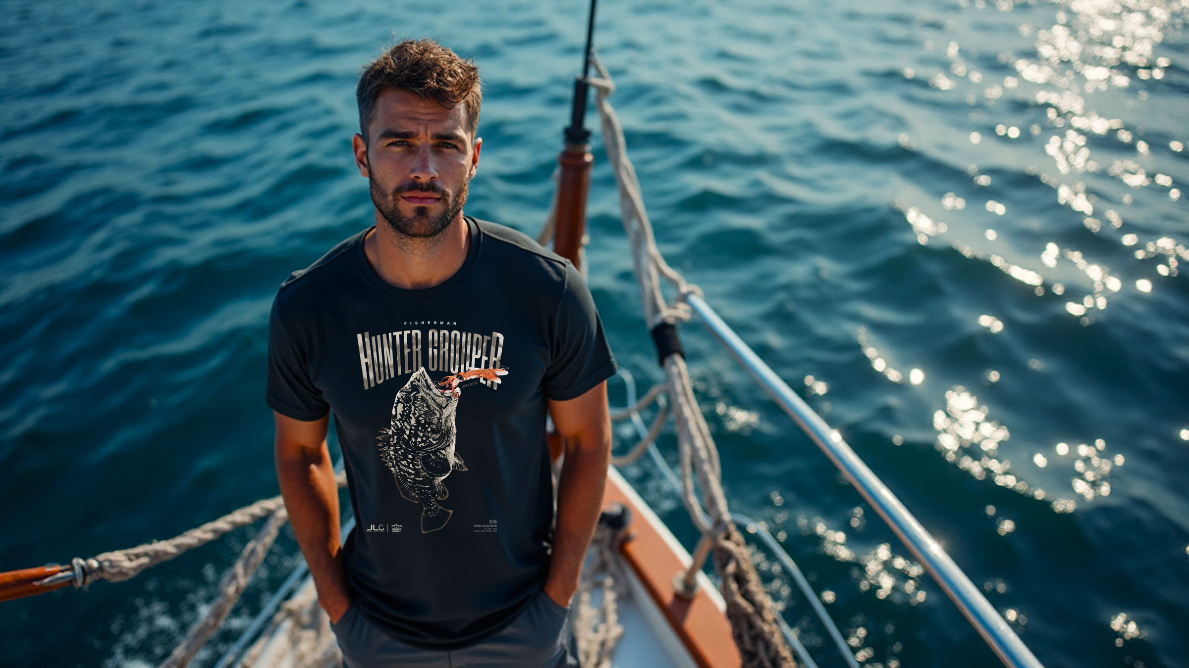 Camisas em poliamida com elastano e proteção UV 50+. Legitimamente saltwater, inspirada nos oceanos.